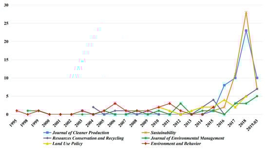 To clearly reveal the publication status of the TPB in environmental science research in each journal, this study analyzed the publication history of the top six source journals according to the statistics of 531 articles, as displayed in Figure 5. The first article on the application of the TPB to environmental science was published in Environment and Behavior in 1995, but this journal did not publish relevant articles from 2016 to 2018. In contrast, there have been an increasing number of relevant articles published in Sustainability and the Journal of Cleaner Production, especially in the past four years. In addition, the number of related studies published in the Journal of Environmental Management and Resources Conservation and Recycling has gradually increased since 2016. Although Land Use Policy is not a journal in the field of environmental science, since 2014, it has published several studies on the application of the TPB to environmental science every year, including an investigation of farmers’ adoption of green fertilizer [34,35] and studies on agri-environmental schemes [36,37], which are all related to the topics of farmers and land. Notably, the publishing trends of these journals shown in Figure 5 are closely related to their annual total number of publications. For example, the average annual publication number of Environment and Behavior is between 40–50 articles, while that of Sustainability reached 7730 in 2018.