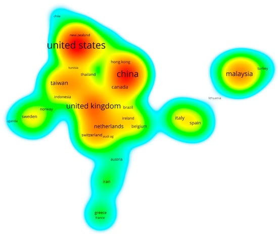 The 531 studies on the application of the TPB to environmental science came from 69 countries and regions (the statistical method is full counting, which covers the information of all the authors in each article). Figure 6 shows the cooperative network heat map for these countries and regions (countries with a small number of productions are covered by colors). Among them, the larger the font size of the label and the redder the color of the area, the more articles that were published in that country or region. Countries/regions located in the center of the network have strong cooperation with others, while countries/regions located in a common color region have close cooperation with each other.
