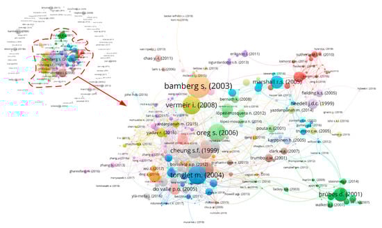 The upper left corner of Figure 7 is a citation network consisting of 531 articles, in which each node represents an article and the links of the connecting node represent the citation relationships. The larger the node and the denser the link, the more cited the article. These highly cited articles are considered to be the key studies in the application of the TPB to environmental science. Since different colors represent different clusters, 153 articles form a large, discrete group on the edge of the network, while the remaining 378 articles (Figure 7, lower right) form 24 focal groups comprising 1111 links. To some extent, this multigroup clustering result suggests that the research topics on environmental behavior are scattered.