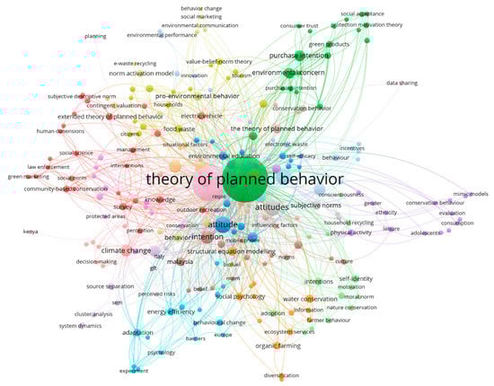 Keywords are descriptive words that briefly reflect the theme, method, and content of an article. The 531 articles retrieved in this study contain 1537 keywords. A total of 252 keywords appearing more than twice were selected for a co-occurrence analysis consisting of a keyword co-occurrence network with 252 nodes and 1071 links. These keywords are divided into 19 clusters of different sizes, as shown in Figure 8. The sizes of the nodes and tags are proportional to the frequency of keyword occurrence. Not surprisingly, the most frequently occurring words are “theory of planned behavior” (190 times) and “theory of planned behaviour” (110 times), as they are the search terms used in this study; “attitude” and its plural ranked second (48 times), indicating that attitude is one of the key predictors in current research on TPB application in environmental science; “recycling” (23 times) ranked third, indicating that recycling behavior is the main theme of TPB research in the field of environmental science; and the fourth is “structural equation modeling” (21 times), which is an empirical method that is widely used in TPB research and considers the mainstream questionnaire research tool of the past decade. It should be pointed out that the above keywords illustrate part of the current status of the application of the TPB in environmental science according to four aspects: theory, construct, research topic, and method. In fact, the 252 keywords appearing more than twice also contain a significant amount of other research information.