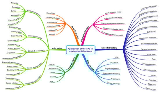 Fifth, regarding the application of the TPB to the field of environmental science, the topics involved mainly include waste management, green consumption, climate and the environment, saving and conservation, and sustainable transportation. The theories used for integration mainly include the NAM, VBN, TIB, PMT, and TAM. The main factors used for model extension include environmental concern, environmental knowledge, environmental awareness, environmental education, environmental performance, self-identity, government incentives, and environmental values. The control variables used for multi-group comparison primarily include culture, education level, gender, income, and age. In addition to the general respondents such as consumers and the public, the objects studied include households, university students, young people, young consumers, adolescents, farmers, and other groups. In addition to SEM and PLS-SEM, the methods employed include logistic regression, agent-based modeling, experimentation, and system dynamics.