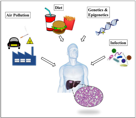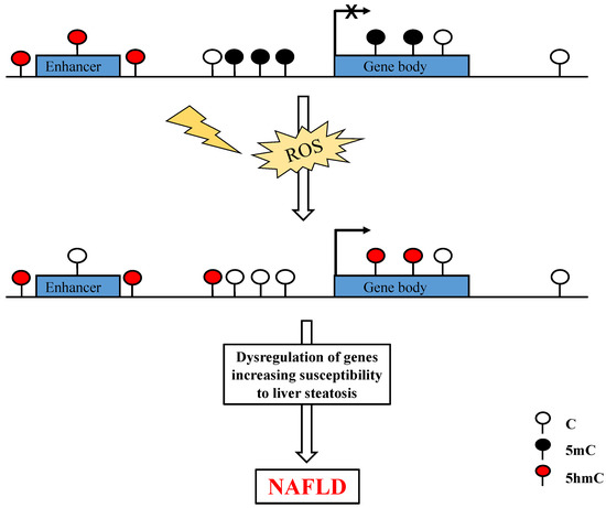 The objective of this review is to outline the impact of environmental exposure on the pathogenesis of NAFLD, with a special focus on an emerging epigenetic mechanism, i.e., DNA hydroxymethylation. Many environmental toxicants are known to promote mitochondrial dysfunction and oxidative stress. There is growing evidence that oxidative stress alters the patterns of 5-hydroxymethylcytosine (5hmC), a primary oxidative product of 5-methylcytosine (5mC), which may influence gene regulation. Thus, investigating the 5hmC-mediated deregulation of genes involved in liver metabolism may provide insight into the interactive role of environment and epigenetics in NAFLD development. A better understanding of the mechanisms of NAFLD genesis and progression can lead to the development of effective preventive strategies and treatment options for this disease. We note that the association between obesity/metabolic syndrome and NAFLD has been discussed in comprehensive reviews [6,14,19]; readers are referred to these elegant references.