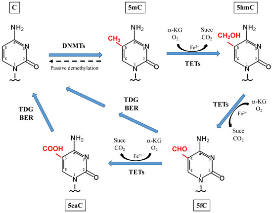 Methylation at the C5 position of cytosine (5mC), mostly in the context of CpG dinucleotides, is the best studied epigenetic mechanism in mammalian cells, with critical functions in transcriptional regulation, development, and other biological processes [31,32,33,34,35,36]. 5mC is a stable covalent modification of the DNA; although in recent years, views on 5mC stability and persistence have drastically changed owing to new insights gained on DNA hydroxymethylation. It is now well-known that 5mC is converted to 5hmC by a DNA methylcytosine dioxygenase, belonging to the ten-eleven translocation (TET) family [37,38,39,40]. TET proteins, including TET1, TET2, and TET3, can sequentially oxidize 5mC to 5hmC, 5-formylcytosine (5fC), and finally to 5-carboxylcytosine (5caC) [41,42,43]. 5fC and 5caC are both repaired by mismatch-specific thymine DNA glycosylase (TDG) -mediated base excision repair (BER) mechanisms, thus resulting in conversion to cytosine, as part of an active process of demethylation (Figure 2) [44].