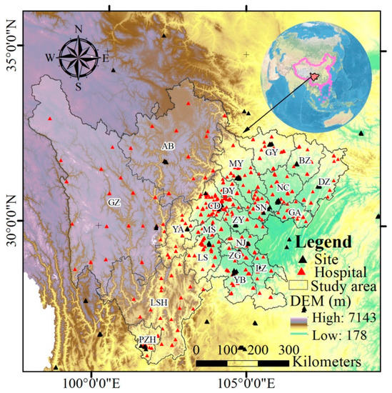 Generally, although many studies have investigated the spatial and temporal patterns, chemical composition, potential sources, and effects of meteorological condition based on six criteria air pollutants, these studies have either ignored public health risk assessment [19,20,21,22,23,24,25], or only focused on a specific city or industrial region [3,15,26]. In the face of increasing risks caused by air pollutants, the public health resilience of different groups of people in Sichuan still needs a systematic and comprehensive analysis. Moreover, the reasonable spatial distribution of hospitals will play a vital role in people’s health, but this region lacks a study on spatial inequality analysis between the risk caused by air pollutants and hospital density. Therefore, the present study attempted to accomplish the following: (1) an assessment of the spatial-temporal patterns of six criteria air pollutants in Sichuan; (2) an evaluation of the risk caused by ambient air pollutants to different age groups on the spatial scale; (3) measurement of the public health resilience to the risk resulting from ambient air pollutants; and (4) analysis of the spatial inequality between the risk caused by air pollutants and hospital density in Sichuan.