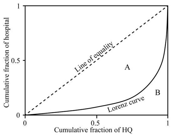 The Lorenz curve is a model used in economics to measure the equitability of the distribution of social resources across the population, and the Gini coefficient can quantify the extent of inequality between two variables [45]. Previous studies identified the regional disparity of emission distribution of air pollutants and socio-economic condition by the Lorenz curve and Gini coefficient [46]. In this study, to calculate the spatial inequality between the risk caused by air pollutants and hospital density (risk is represented by HQ, hospital density is quantified by density analysis result of hospital point), this relationship is performed as a curve with a concave slope (Figure 2). The perfect equality line is the upper limit of the Lorenz curve, and a greater gap between the perfect equality line and Lorenz curve that leads to greater distribution inequality. The Gini coefficient evaluates the extent of inequality by comparing the area between the Lorenz curve and the perfect equality line (A) and the area under the equality line (A + B) (Figure 2) [47]: