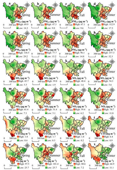According to the spatial distribution of six criteria air pollutants in Sichuan from spring to winter (Figure 3), we discovered that the PM2.5 and PM10 have the same pattern, with the maximum distribution in Sichuan Basin, and the minimum distribution in the northwest part of Sichuan (Figure 3a–h). Furthermore, the highest concentrations of PM2.5 and PM10 occurred in winter, and ranged from 17.3 to 112.9 μg m−3 and from 32.3 to 157.3 μg m−3, respectively. According to Figure 3i–l,q–t, Panzhihua had the highest concentrations of SO2 and CO in spring (29.9 μg m−3 and 1.3 mg m−3, respectively), summer (28.2 μg m−3 and 1.3 mg m−3, respectively), fall (36.6 μg m−3 and 1.6 mg m−3, respectively), and winter (40.6 μg m−3 and 4.7 mg m−3, respectively). The concentration ranges of NO2 were 7.3–61.4 μg m−3, 5.1–51.4 μg m−3, 6.2–59.4 μg m−3, and 11.0–70.4 μg m−3, in spring, summer, fall, and winter, respectively (Figure 3m–p); the maximum values were primarily distributed in Chengdu. However, the highest O3 concentration occurred in summer (25.7–101.4 μg m−3), and the lowest concentration occurred in winter (11.1–66.9 μg m−3) (Figure 3v,x). We also found that in summer the maximum O3 concentration was chiefly located in Sichuan Basin, while the minimum concentration was in Bazhong.
