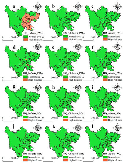 Risk assessment of chronic exposure to main air pollutants in Sichuan. (a–c)/(d–f)/(g–i)/(j–l) represent hazard quotient for infants, children, and adults for PM2.5 (HQ_Infants_PM2.5, HQ_Children_PM2.5, and HQ_Adults_PM2.5)/PM10 (HQ_Infants_PM10, HQ_Children_PM10, and HQ_Adults_PM10)/SO2 (HQ_Infants_SO2, HQ_Children_SO2, and HQ_Adults_SO2)/NO2 (HQ_Infants_NO2, HQ_Children_NO2, and HQ_Adults_NO2), respectively.