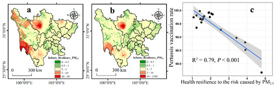 Since research assessing the health resilience to the risk caused by ambient air pollutants is in progress, there is a current lack of studies that verify the validity of health resilience assessment. Hence, a correlation analysis was conducted on the pertussis vaccination rate and average health resilience of infants to the risk caused by PM2.5 in 21 cities in Sichuan. There is a correlation coefficient of 0.79, which indicates that a better health resilience to the risk caused by air pollutants will lead to weaker vaccination awareness (Figure 5c).
