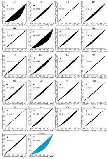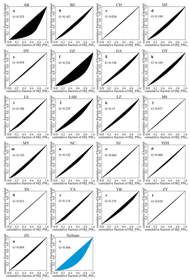 Spatial inequality analysis between the infant hazard quotient caused by PM2.5 (HQ_PM2.5) and hospital density: (a) Aba, (b) Bazhong, (c) Chengdu, (d) Dazhou, (e) Deyang, (f) Ganzi, (g) Guangan, (h) Guangyuan, (i) Leshan, (j) Liangshan, (k) Luzhou, (l) Meishan, (m) Mianyang, (n) Nanchong, (o) Neijiang, (p) Panzhihua, (q) Suining, (r) Yaan, (s) Yibin, (t) Ziyang, (u) Zigong, and (v) Sichuan.