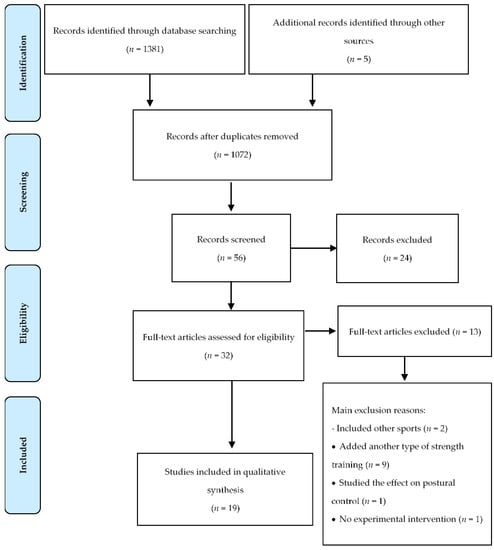 From the database search, 1381 files were found to which five more were added from other sources. These data were then exported to reference manager software (EndNoteTM X8, Clarivate Analytics, Philadelphia, PA, USA), and 314 duplicates were eliminated. The remaining 1072 files were screened for relevance according to their titles and abstracts; through this process, another 1016 articles were removed. After the full texts of the remaining 56 articles were read, another 24 were excluded due to a lack of relevance to the specific purpose of the current study. In the final step of the screening procedure, another 13 articles were eliminated either because they included other sports in their analysis (n = 2), added another strength methodology training (n = 9), studied the effect of training on postural control (n = 1) or indicated no experimental intervention (n = 1). After the entire screening process was complete, 19 files were deemed acceptable for inclusion in the present review. A schematic summary of this search is shown flowchart in Figure 1.