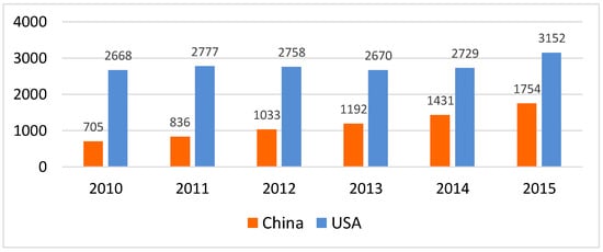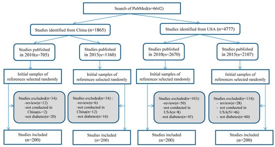 The PubMed search yielded a total of 6642 references for studies published in 2010 and 2015. The number of studies conducted in China was 705 in 2010 and 1160 in 2015, and the number of studies conducted in the USA was 2670 in 2010 and 2107 in 2015. Considering time and resource limitations, a total of 800 studies were included in the analysis. The process of selection of relevant studies is shown in Figure 1.