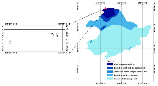 The study site was situated in the experimental area of the Mohe Forest Ecosystem National Positioning Observation and Research Station in Heilongjiang province (53°17′~53°30′ N, 122°06′~122°27′ E) (Figure 1). The experimental area is located in the permafrost area of the Daxing’an Mountains, with low hills at an average elevation of 300~500 m. It is controlled by a cold temperate continental monsoon climate with an annual average temperature of −3.3 °C and precipitation of 442.95 mm (monitored in 2016 and 2017). In this region, 66.47% of the precipitation is concentrated in summer (from June to August). Furthermore, the soil activity layer freeze-thaw period lasts for about half a year (from mid-April to mid-October), which is slightly longer than the snowpack cover time (from late October to early April). The annual sunshine hours are 2377~2625 h, with an annual total solar radiation of 402~448 kJ cm−2, and ≥10 °C annual accumulated temperature of 1436~2062 °C. The zonal soil of the study site is dark brown forest soil. The vegetation in this area belongs to the southern extension of the Eurasian cold-temperate coniferous forest. The zonal vegetation is dominated species of Larix gmelinii. Other major species include Betula platyphylla, Pinus sylvestris var.mongolica, Populus davidiana, etc. Common plants include Ledum palustre var. dilatatum, Rhododendron dauricum, Vaccinium uliginosum, Vaccinium vitis-idaea, and Pyrola incarnate. Sample selection was based on representative and feasibility principles. After comprehensive investigation, the three most typical forest types in the permafrost region of the Daxing’an Mountains: Larix gmelinii forest (LF), Pinus sylvestris var.mongolica forest (PF), Betula platyphylla forest (BF) were selected. One 100 m × 100 m fixed experimental block with similar site conditions was set in each forest type (LF, PF and BF), and a total of 3 experimental blocks were set. All acronyms such as LF, PF, and BF which applicable for all tables and all figures.