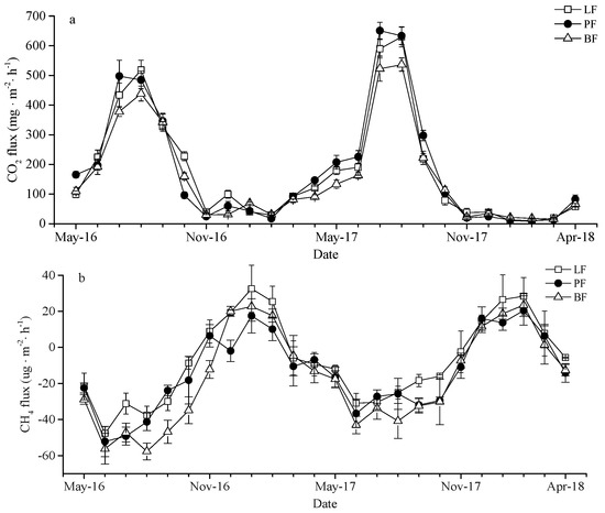 3.1. The Temporal Variation of Soil CO2 Fluxes across LF, PF, and BF