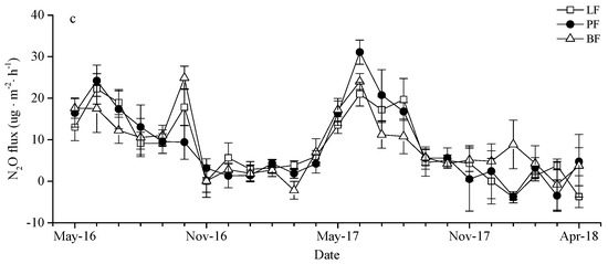 The soil N2O fluxes of the three forest types were largely consistent during the monitoring period of 2016~2018 (Figure 2c). The soil N2O fluxes ranged from −3.87 ± 1.35 ug·m−2·h−1 to 31.1 ± 2.92 ug·m−2·h−1 in LF, PF, and BF. Emissions during the non-growing season were at a relatively low value with a small amount of absorption and concentrated during the growing season. Soil N2O fluxes showed a bimodal trend during 2016–2017, and a unimodal trend during 2017~2018. The maximum soil N2O fluxes of LF (22.25 ± 3.66 ug·m−2·h−1) and PF (31.1 ± 2.92 ug·m−2·h−1) were recorded in June, and those for BF (24.91 ± 2.8 ug·m−2·h−1) in October. In contrast, the minimum absorption of N2O fluxes were recorded in January (LF: -3.87 ± 1.35 ug·m−2·h−1, PF: −3.68 ± 0.68 ug·m−2·h−1) and March (BF: −2.17 ± 2.13 ug·m−2·h−1), respectively. The average annual flux of N2O for PF (13.33 ug·m−2·h−1) were higher than LF (11.8 ug·m−2·h−1) and BF (11.45 ug·m−2·h−1). The soil N2O fluxes in coniferous forest were higher than in broad-leaved forest.