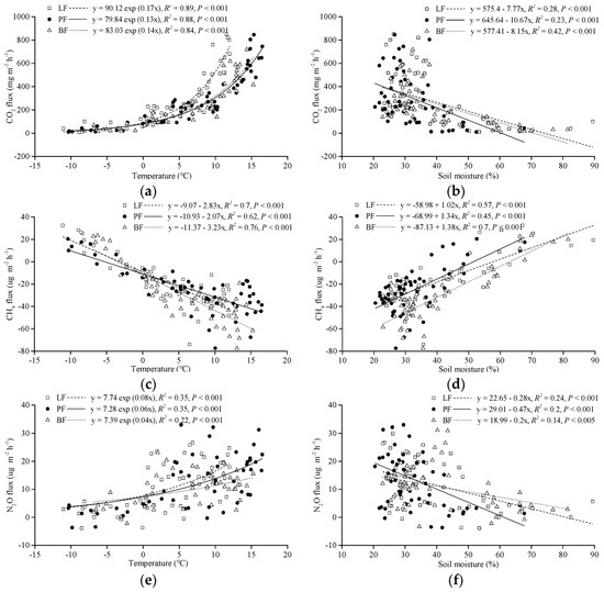 Relationships between (a) CO2 fluxes and soil temperature, (b) CH4 fluxes and soil temperature, (c) N2O fluxes and soil temperature, (d) CO2 fluxes and soil moisture, (e) CH4 fluxes and soil moisture, and (f) N2O fluxes and soil moisture in LF, PF, and BF.
