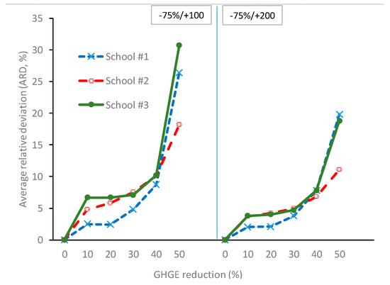 Figure 1. Average relative deviation (ARD) in relation to GHGE reduction (by steps of 10%) when minimizing total relative deviation (TRD) and applying constraints on nutritional adequacy, relative GHGE reductions, and additionally constraining the relative deviation (RD) of individual food items from observed food supply to a range between −75%/+100 and −75%/+200% (Model 3). GHGE, greenhouse gas emissions. The RD of the optimized solutions refers to the observed food supply during the school year 2015/2016.