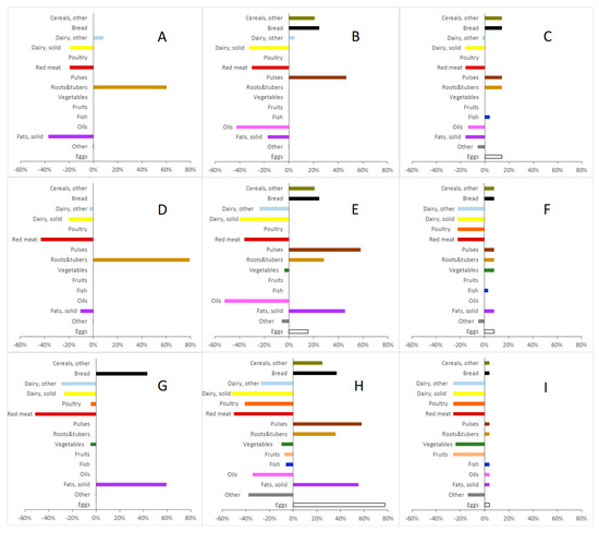 Figure 2. Effect of GHGE reduction (Panels AC, −20%; DF, −30%; GI: −40%), limited relative food deviation (RD) (Panels A,D,G, unconstrained (Model 2); B,E,H, maximum RD: −75%/+100% (Model 3); Panels C,F,I, as Model 3 plus maximum allowed differences between relative changes of food groups (RFGDs) of 30% (Model 4) on relative changes of food groups in School 1. All provided solutions accommodate the nutritional guidelines for Swedish school meals [32].