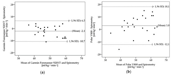 Figure 1 shows Bland-Altman plots of the sports watches PV800 and GF920XT in comparison with spirometry with CM3B.
