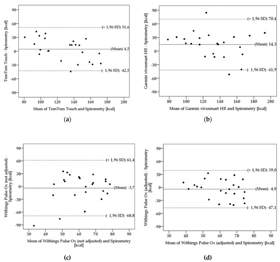 Figure 2 shows Bland-Altman plots of the tested fitness trackers in comparison with spirometry. These plots serve as a visual illustration of scattering and over- or underestimated measurement ranges of the investigated fitness trackers.
