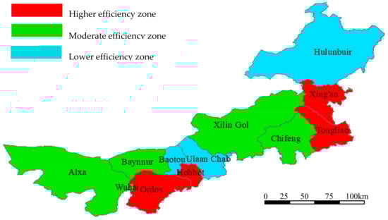Table 3). The different efficiency zones are marked on the map of Inner Mongolia in different colors (