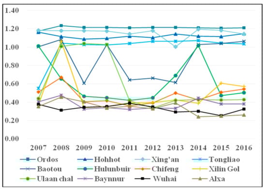 The average efficiency change in Inner Mongolia cities was 1.024, an increase of 2.4%—pure technical efficiency change increased by 1.3% and the scale efficiency change increased by 3.6%. Pure technical efficiency change and scale efficiency change jointly promoted the increase in TFP. From 2010 to 2012, average pure technical efficiency change remained at 1—the growth of which was zero. At this time, average efficiency change was equivalent to the average scale efficiency change, which indicated that efficiency change was mainly due to scale efficiency change. From 2012 to 2013, average efficiency change decreased by 0.2%—average pure technical efficiency change decreased by 7.6%, while average scale efficiency change increased by 11.8%, indicating that the decline in efficiency change was primarily due to the decrease in pure technical efficiency change. It also showed that the comprehensive TFP in each city was mainly restricted by pure technical efficiency change in that year. From 2014 to 2015, average efficiency change decreased by 11%—average pure technical efficiency change decreased by 5.8%, while average scale efficiency change decreased by 5%, indicating that the decline in pure technical efficiency change and scale efficiency change jointly resulted in the decrease in TFP. Overall, the promotion of the TFP was primarily driven by the growth of scale efficiency change.
