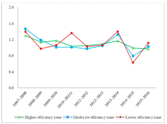 Figure 4 shows the line chart of the average ML values of each efficiency zone from 2007 to 2016.