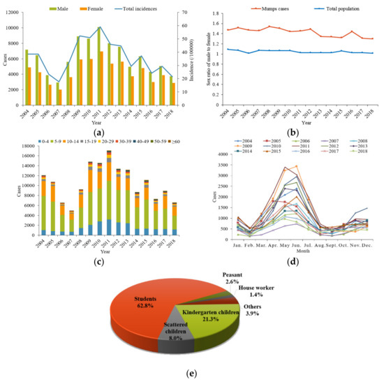 APA StyleZhu, H., Zhao, H., Ou, R., Xiang, H., Hu, L., Jing, D., Sharma, M., & Ye, M. (2019). Epidemiological Characteristics and Spatiotemporal Analysis of Mumps from 2004 to 2018 in Chongqing, China. International Journal of Environmental Research and Public Health, 16(17), 3052. https://doi.org/10.3390/ijerph16173052