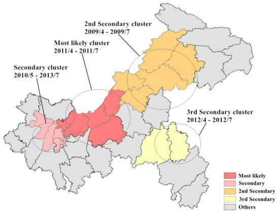 - Tango, T.; Takahashi, K. A flexibly shaped spatial scan statistic for detecting clusters. Int. J. Health Geogr. 2005, 4, 1–15. [Google Scholar] [CrossRef]