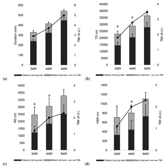 Accumulative weekly (a) duration; (b) total distance (TD); (c) running distance (RD); (d) high-speed running (HSR) and their training/match ratios (TMr). &: significantly different from 5dW.