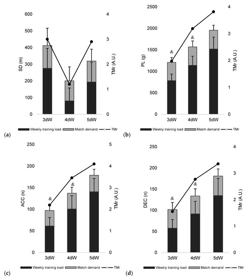 Accumulative weekly (a) sprinting distance (SD); (b) player load (PL); (c) number of accelerations (ACC); (d) number of decelerations (DEC) and their training/match ratios (TMr). &: significant different from 5dW.
