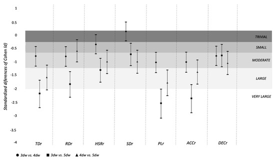 Standardized differences of TMr between types of weeks are shown in Figure 3. TDr was significantly greater in 5dW compared 3dW (mean differences [dif]: 1.23 A.U.; p = 0.000) and 4dW (dif: 0.80 A.U.; p = 0.000). RDr was significantly greater in 5dW than in 3dW (dif: 0.84 A.U.; p = 0.000) and 4dW (dif: 0.40 A.U.; p = 0.005). HSRr was significantly greater in 5dW than in 3dW (dif: 0.90 A.U.; p = 0.000) and 4dW (dif: 0.68 A.U.; p = 0.000). PLr was significantly greater in 5dW than in 3dW (dif: 1.34 A.U.; p = 0.000) and 4dW (dif: 0.85 A.U.; p = 0.000). ACCr was significantly greater in 5dW than in 3dW (dif: 1.46 A.U.; p = 0.000) and 4dW (dif: 0.84 A.U.; p = 0.000). Finally, DECr was significantly greater in 5dW than in 3dW (dif: 1.34 A.U.; p = 0.000) and 4dW (dif: 0.77 A.U.; p = 0.000).