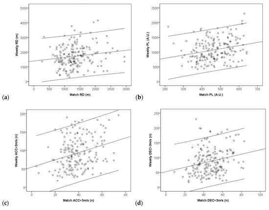 Scatter plots of relationships between accumulated weekly training external load and the match demands for the same week: (a) running distance, (b) player load, (c) total accelerations (>3 m·s−2); (d) total decelerations (>3 m·s−2).