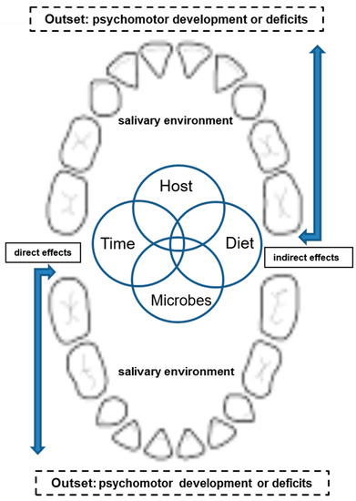 A new hypothesis is proposed, with edited modifications of the Classical Kele’s four circles during the initiation or progression of dental caries. Figure legend: A new hypothesis is proposed, based on the Classical Kele’s four Circles (i.e., host, diet, microbes, time), where the clinical manifests of psychomotor deficiency, in the context as an outset during the development, may interactively influence “directly” (i.e., via neuro-physiologic circus) or “indirectly” (i.e., via outside the neurologic circus) all 4 components on the initiation and/or progression of ECC in our oral cavity sounded by the saliva & salivary environment. Some of the external factors may include the knowledge, attitude and behaviors (i.e., hygiene habits), or any other environmental measures (i.e., disability, special needs, etc.) affecting the psychomotor risks [27].