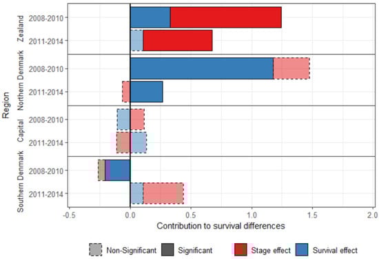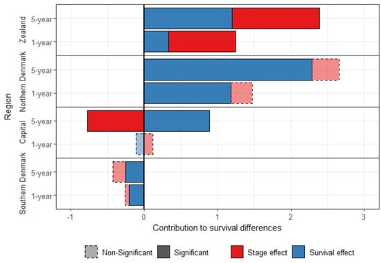 Zealand also had a more adverse stage-at-diagnosis distribution than Central Denmark, with 44.9% (one-year) and 26.5% (five-year) of the difference in breast cancer survival between the two regions being attributable to the stage effect (both significant, decompositions for other regions in Appendix D).