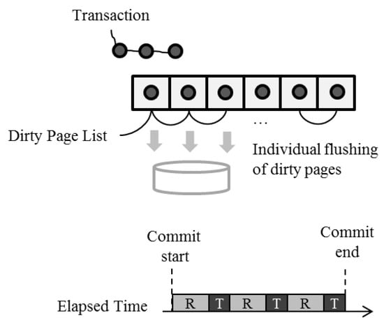 Figure 4 shows the large transaction processing of SQLite with a timeline when dirty page reclamation is involved. Writing new data to a buffer alternates with reclaiming a buffer in use. As the small write to storage intermittently continues to occur throughout the entire process, the transaction latency significantly increases.