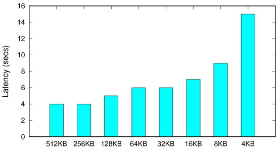 The proposed cleaning scheme, termed proactive and coarse-grained cleaning, periodically examines the number of reclaimable dirty pages in the buffer. If the dirty pages have accumulated sufficiently to optimally perform storage write, SQLite forces them to storage in a batch. Because the performance of block storage devices has been optimized for throughput for last decades to alleviate their intrinsic long latency, a large-sized write can be performed orders of magnitude more efficiently than many of those that are small. To quickly verify the efficacy of our approach, we measured the latency of a 4 GB write to storage varying the I/O size from 4 KB to 512 KB. The performance was measured over the HFS+ file system mounted on 512 GB SSD (Solid-State Drive). Figure 5 shows that the I/O latency exponentially increases as the write granularity decreases. The latency of the fine-grained write (i.e., 4 KB) takes 3.5× higher than that of the coarse-grained write (i.e., 512 KB). These experimental results strongly support our proactive and coarse-grained cleaning scheme. Meanwhile, as shown in the figure, the performance variation decreases when the write size is larger than 32 KB, and the performance saturates at a size of 256 KB.