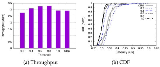 We investigated the performance of SQLite with respect to the different threshold values at which the cleaning operation is invoked in our proposed scheme. We represent the threshold as the ratio of dirty pages in the buffer and measure the performance varying the threshold value from 0.2 to 1. Figure 9a shows the SQLite throughput as a function of the threshold value and Figure 9b shows the CDF (Cumulative Distributed Function) of transaction latency for the same threshold spectrum. This result is obtained using SQLite-PCG running in the WAL journaling mode.