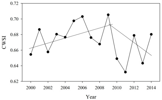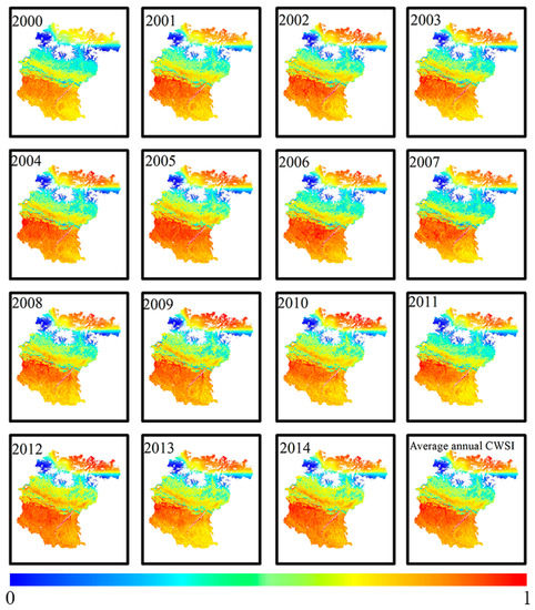 Figure 6 presents annual variations of CWSI of KRB during 2000–2014, and the CWSI value ranges from 0.63 to 0.71, indicating that overall the Koshi River Basin is dominated by moderate drought. The CWSI ranging from 2000 to 2014 shows significant interannual fluctuation, and higher CWSI occurred in 2001, 2005, 2006 and 2009, with the lower values in 2010, 2011 and 2013. For 15 years CWSI, we could divide into two stages: rising stage and falling stage. During 2000 to 2009, the CWSI showed an obvious increasing trend, suggesting that the drought degree increases. However, a significant fluctuant falling trend in CWSI was observed from 2009 to 2014.