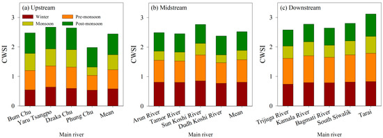 Figure 5 shows the distribution of CWSI from four seasons, winter, pre-monsoon, monsoon and post-monsoon. Obviously, the mean CWSI from different rivers showed a similar pattern, and the lowest CWSI occurred in Monsoon period. For pre-monsoon, the CWSI in downstream was significantly higher than that of the midstream and that of the upstream, indicating that severe drought occurred in the downstream and light drought occurred during the pre-monsoon. For winter and pre-monsoon, the light drought occurred in upstream; while the monsoon and post-monsoon showed light drought in the midstream, suggesting that significant drought occurred in the pre-monsoon.