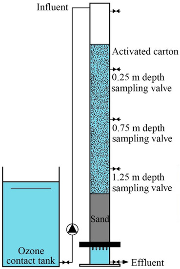 A Plexiglass cylinder (200 mm diameter and 2.6 m length) filtration column was constructed and filled with a 200 mm supporting layer, a 500 mm sand layer (0.4–0.8 mm particle size), and a 1500 mm cracked activated carbon layer (0.9–1.1 mm particle size) from bottom to top, with reference to a typical water plant in Shenzhen (shown in Figure 1). Sampling ports for activated carbon were equipped at the 0.25 m, 0.75 m, and 1.25 m depths of the cracked activated carbon layer. The specification of the cracked activated carbon is listed in Table 1. The intake was at the top and the outlet was at the bottom. The pilot-scale filter was fed with the effluent of an ozonation contact reactor from the same water plant, with an ozone concentration of 5.0–10.0 mg/L and a hydraulic loading of 8 m/h. The filter operated for 360 days and no backwash was conducted for the maturation of the biomass.