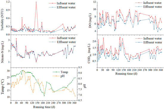 The pilot-scale BAC filter in this study operated over 360 days. Parameters including CODMn, DO, turbidity, nitrate nitrogen concentrations of influent and effluent water, as well as the pH and temperature of effluent water, were continuously determined. As revealed in Figure 2, the CODMn of effluent water was between 0.48 to 1.88 mg/L (mean value 0.97 mg/L), and that of influent water was between 0.63 to 2.31 mg/L (mean value 1.31 mg/L). The CODMn was effectively reduced by the pilot-scale filter, with an average removal rate of 26.43%. The turbidity of influent water fluctuated in a range from 0.10 to 1.19 nephelometric turbidity units (NTU) (mean value 0.22 NTU), whereas the range of the effluent water turbidity was evidently narrowed, as the concentration varied from 0.07 to 0.31 NTU (mean value 0.16 NTU). The average removal rate of turbidity was 16.57%. However, an increase of turbidity was observed occasionally, and might have been caused by a leakage of activated carbon powder or bio flocs.