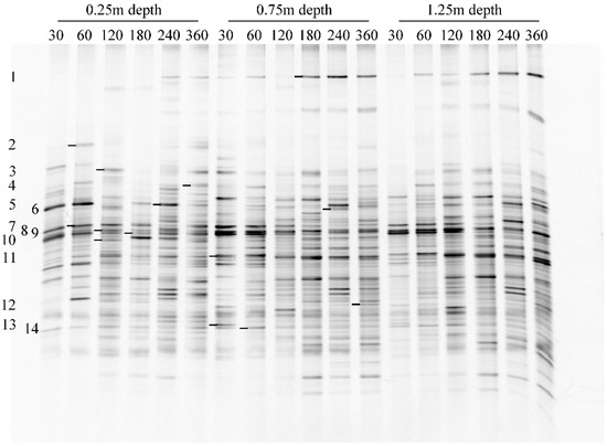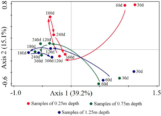 The ordination plot of the PCA revealed the routes for different depths. The 0.25 m depth started at the first quadrant and moved down-leftward at day 120, then straightened and moved upward in the PC2 at day 180, and finally went down to the negative axis of PC1 at day 360. The 0.75 and 1.25 m depths both started at the fourth quadrant and moved up-leftward at day 120. Then, the 1.25 m depth continued moving leftward in the PC1 at day 180, and went rightward at days 240 and 360. However, the 0.75 m depth moved slightly and irregularly.