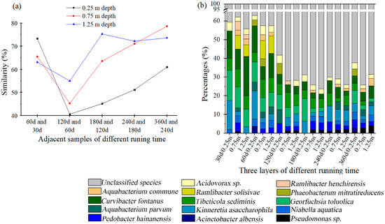 Similarity changes between time-adjacent samples from different carbon layers (a), relative abundances of bacterial species attached on different activated carbon samples (b).