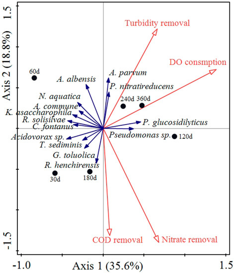 - RDA revealed that Ramlibacter henchirensis was positively correlated to CODMn removal and nitrate-N removal. Georgfuchsia toluolica showed a positive correlation with CODMn removal. Aquabacterium parvum and Phaeobacterium nitratireducens were positively associated with turbidity removal. Pedobacter glucosidilyticus and Pseudomonas sp. were associated with a high DO consumption.