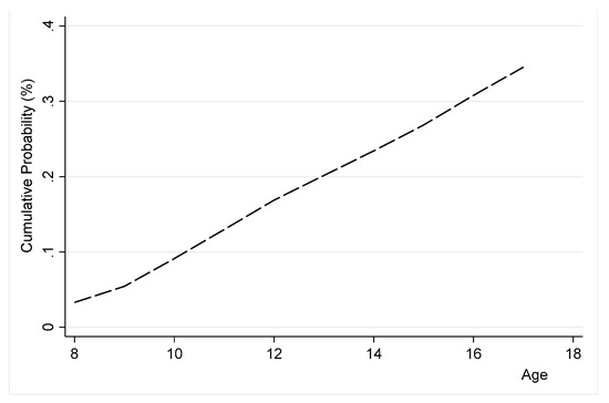 We used all the survey samples of GYTS data from Ghana and Nigeria with a sample size of 18,231 and 2678, respectively. In the panel data that we generated, the number of observations in Ghana and Nigeria was 107,880 and 15,669, respectively. In Table 3, we summarized the models’ variables. The table shows that approximately 5% and 3.3% of students in our sample initiated in Ghana and Nigeria, respectively. Figure 1 and Figure 2 show the trends in the cumulative risks of initiation into using tobacco products in Ghana and Nigeria, respectively. They show that the accumulative risk of initiation in both countries increased sharply over the age profile. Students in Ghana accumulated more than 40% risk of initiation before age 16. Students in Nigeria faced a lower accumulated risk at age 16 compared to Ghana.