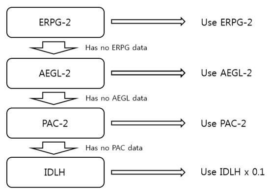 In this study, the endpoint concentration was calculated using the Emergency Response Planning Guide (ERPG-2) value when the ERPG-2 value was available. If ERPG-2 was not available, the AEGL-2, PAC-2, and IDLH values were converted to criteria as in Figure 1.