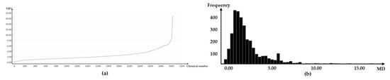 MD distribution of 3028 chemicals: (a) Distribution of MDs in ascending order; and (b) frequency distribution of MDs.