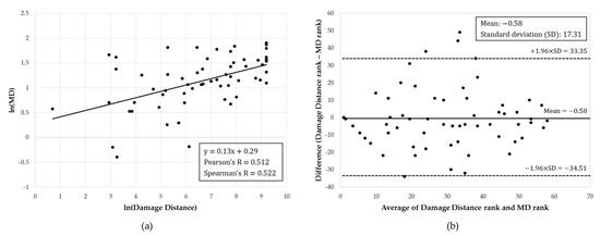 Comparison of matched ratio between MD and Damage Distance for 60 chemicals that require an accident plan: (a) Comparison between MD and Damage Distance and (b) Bland–Altman plot of MD and Damage Distance.