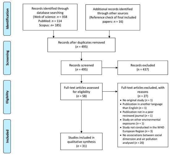 Three electronic databases Scopus, Web of Science and MEDLINE (via Pub Med) were searched on 23 April 2018. A wide range of search terms for air quality and social dimensions characteristics were considered along with inequity and inequality or using environmental justice terms using Boolean operators. In PubMed Medical Subject Headings were also used (see Table S2 for search terms).