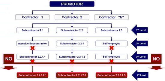 - BOE. Real Decreto 1109/2007, de 24 de agosto, por el que se desarrolla la Ley 32/2006, de 18 de octubre, reguladora de la subcontratación en el Sector de la Construcción. Boletín Oficial del Estado N° 204, 25 August 2007; 35747–35764. Available online: https://www.boe.es/boe/dias/2007/08/25/pdfs/A35747-35764.pdf (accessed on 15 April 2019).